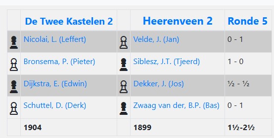 Helaas weer een verlies voor het tweede team van DTK. Ditmaal bleken de schakers van het tweede team van Heerenveen net wat slagvaardiger dan de DTKers en konden zij huiswaarts keren met een 2,5-1,5 overwinning op zak.