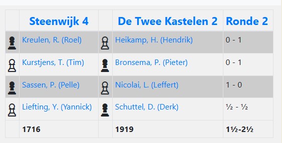 Het tweede team van DTK heeft ook zijn tweede wedstrijd in de competitie weten te winnen. Wederom werd het een 2,5-1,5 overwinning, ditmaal was het 4e team van Steenwijk de tegenstander. Net als in de wedstrijd tegen Bakkeveen was ook nu weer de uitslag van de laatste partij beslissend.